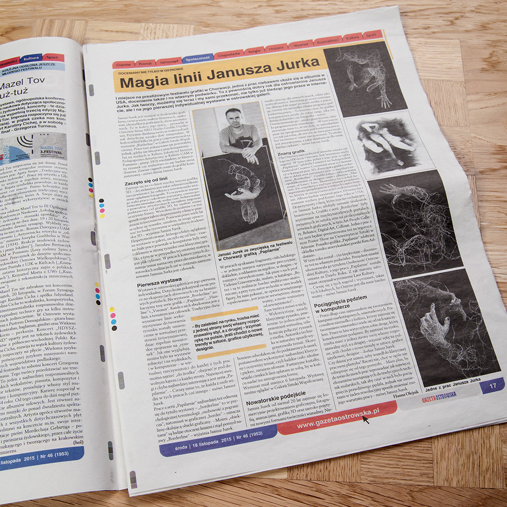 Wystawa w ostrowskiej galerii jest jego pierwszą indywidualną. Dotychczas pokazywał swoje prace na ekspozycjach zbiorowych czy na branżowych portalach. Na wystawie „Borderline” zobaczymy trzy serie grafik – „Papilarnie”, „Hairline” i „Voronoi”. Każda z nich zbudowana jest z linii, a tematem jest człowiek. Tradycyjne dwuwymiarowe linie wykorzystywane do tworzenia rysunku zostały umieszczone w wirtualnej przestrzeni trójwymiarowej dając zupełnie nowatorskie spojrzenie na „rysunek”. Jak one wyglądają, można było na wystawie zobaczyć i na wydrukach i w komputerze – w wirtualnej rzeczywistości do każdej z tych prac można zajrzeć „do środka”, obejrzeć je pod dowolnym kątem i z każdej strony. Najwięcej uwagi i chyba najbardziej interesująca jest seria „Papilarnie”. – Cieszy mnie to, że każda z osób widzi w tych pracach coś innego – mówi Janusz Jurek.