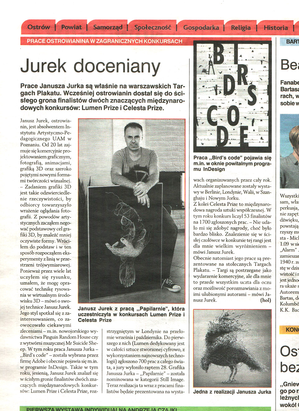 Zadaniem grafiki 3D jest takie odzwierciedlenie rzeczywistości, by odbiorcy towarzyszyło wrażenie oglądania fotografii. Z powodów artystycznych zacząłem negować podstawowy cel grafiki 3D, by znaleźć mniej oczywiste formy. Wróciłem do podstaw i w ten sposób rozpocząłem eksperymenty z linią w przestrzeni trójwymiarowej. Ponieważ przez wiele lat uczyłem się rysunku uznałem, że mogę opracować technikę rysowania w wirtualnym środowisku 3D – mówi o swojej technice Janusz Jurek. Jego styl spotkał się z zainteresowaniem, co zaowocowało ciekawymi zleceniami – m.in. nowojorskiego wydawnictwa Pinguin Random House czy z wytwórni muzycznej Mr Suicide Sheep. W tym roku praca Janusza Jurka – ,,Bird`s code” – została wybrana przez firmę Adobe i obecnie pojawia się m.in. w oknie powitalnym programu InDesign. Niedawno wykonał też artystyczną wizję statuetki wręczanej na The Game Awards 2016 (odpowiednik filmowego Oscara w branży gier wideo). Ta kreatywna interpretacja (a nie statuetka) będzie teraz motywem przewodnim podczas całej gali finałowej w Microsoft Theater w Los Angeles. Także w tym roku, jesienią, Janusz Jurek znalazł się w ścisłym gronie finalistów dwóch znaczących międzynarodowych konkursów: Lumen Prize i Celesta Prize, rozstrzygniętym w Londynie na przełomie września i października. Do pierwszego z nich (Lumen dedykowany jest w całości sztuce stworzonej cyfrowo, z wykorzystaniem najnowszych technologii) zgłoszono 700 prac z całego świata, a jury wyłoniło raptem 28. Grafika Janusza Jurka – ,,Papilarnie” – została nominowana w kategorii Still Image. Teraz realizacja ta wraz z pracami finalistów będzie prezentowana na wystawach organizowanych przez cały rok. Aktualnie zaplanowane zostały wystawy w Berlinie, Londynie, Walii, w Szanghaju i Nowym Jorku. Z kolei Celesta Prize to międzynarodowa nagroda sztuki współczesnej. W tym roku konkurs liczył 53 finalistów na 1700 zgłoszonych prac. – Nie udało mi się zdobyć nagrody, choć było bardzo blisko. Znalezienie się w ścisłej czołówce w konkursie tej rangi jest dla mnie wielkim wyróżnieniem – mówi Janusz Jurek. Obecnie natomiast jego prace są prezentowane na stołecznych Targach Plakatu. – Targi są postrzegane jako wydarzenie komercyjne, ale dla mnie to przede wszystkim uczta dla oczu oraz możliwość porozmawiania z moimi ulubionymi autorami – mówi Janusz Jurek. (hol) Hanka Olejnik.